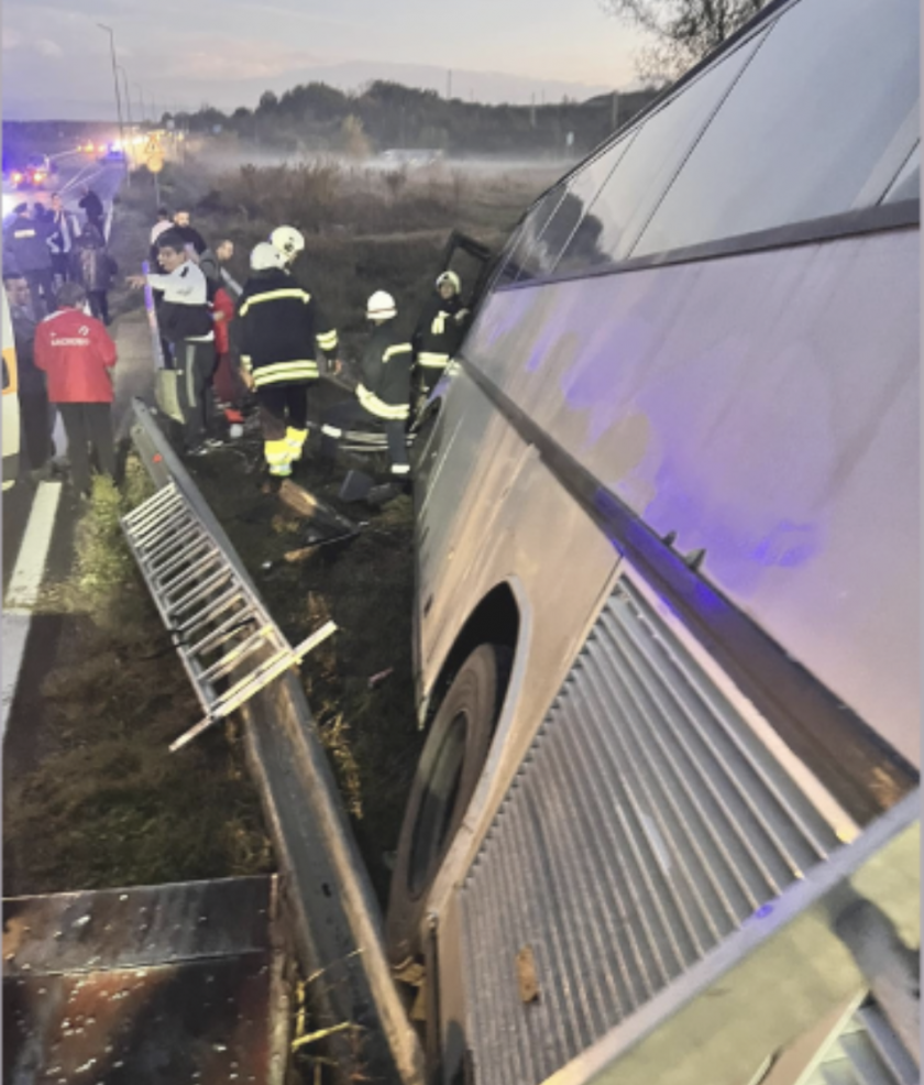 Автобус, превозващ 14 работници на мини „Марица Изток“, надвисна над дере, след като бе засечен и се удари в тир на пътя Симеоновград – Харманли, съобщиха от полицията.