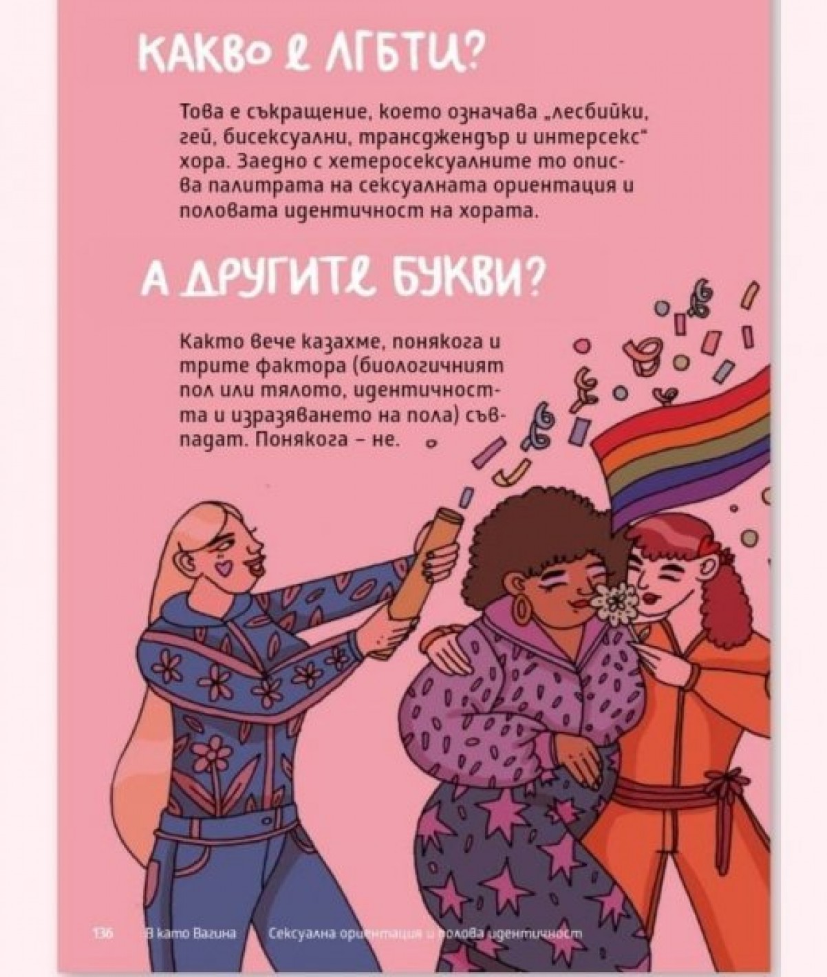 „Няма да коментирам глава „Мастурбация“ и „Право на аборт“ по простата причина, че не симпатизирам на насърчаването на ранното сексуално узряване сред 5-6 годишни деца.“ Въпроси към авторите на детската книжка „В като вагина“, финансирана от Българския хелзинкски комитет, зададени от Ирини Зикидис във Фейсбук.